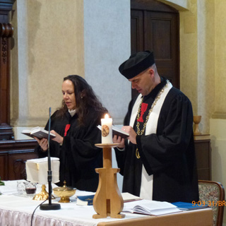 Zpívaná liturgie během bohoslužby vychází z tzv. liturgie Karla Farského, která vznikla s použitím prvků zbožnosti Církve českolovenské husitské a prvků římsko-katolické a pravoslavné liturgie Jana Zlatoústého ze 4. století, jež svými kořeny sahají do časů apoštolských.